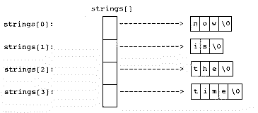 There are two ways to implement arrays of strings in C: 1) as arrays of pointers, and 2) as two-dimensional arrays of characters. The program in Listing 6 illustrates the first approach. The memory layout looks like this: