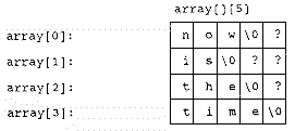 A disadvantage to the ragged array approach is that in most circumstances you need to dynamically allocate memory for each string. If you don't mind wasting a little bit of space, and if you know the length of the longest string you will encounter, you can use a fixed-size region of storage as a two-dimensional array of characters (one string per row). The memory layout for the array in Listing 7 is: