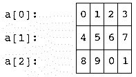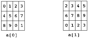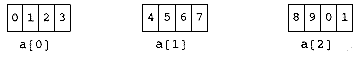 int a[3][4] = {{0,1,2,3},{4,5,6,7},{8,9,0,1}};is a collection that looks like this: