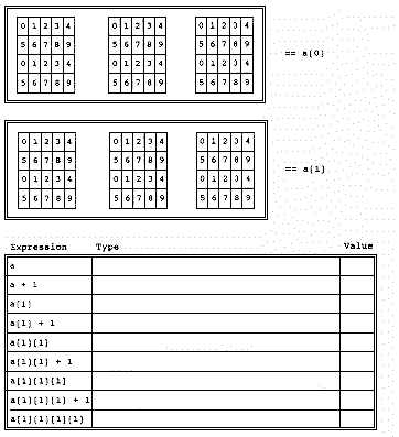 int (*p)[3][4] = a;Listing 9 has a sample program using such a pointer, and Table 2 is the 3-d analogue of Table 1.The programs in both Listing 8 and Listing 9 show how to determine the "rank" (or dimension) of an array and all of its sub-arrays. For the 2-d array a in Listing 8, the rank is the number of rows (1-d objects) it contains, which is